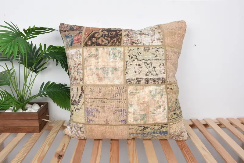 Almohada de lanzamiento de patchwork beige y verde, cojín bordado vintage