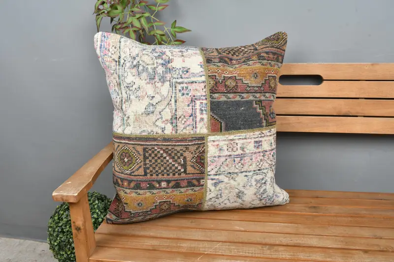 Almohada de lanzamiento de patchwork beige y gris, almohada vintage bordada