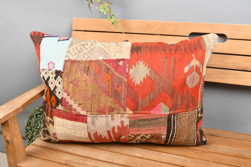 Almohada de tiro patchwork rojo y beige, cojín bordado hecho a mano