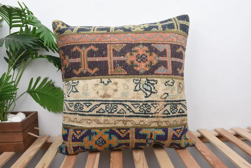 Almohada de tiro patchwork azul y naranja, cojín bordado 24x24