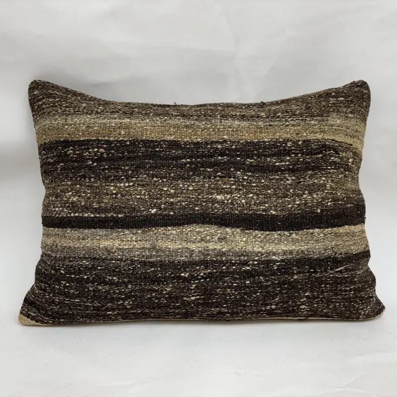 Almohada de lino a rayas marrón y beige, almohada de lanzamiento bordada vintage