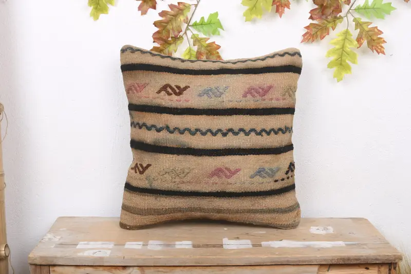 Almohada de tiro a rayas beige y marrón, cojín vintage bordado