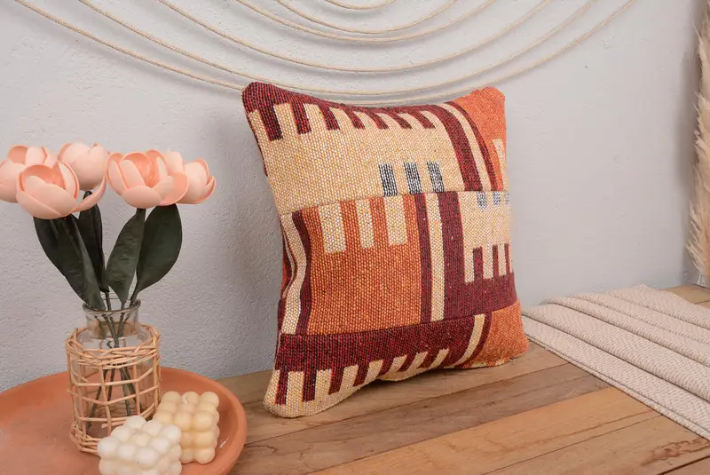 Almohada de tiro bordada beige y naranja, cojín hecho a mano con encanto vintage