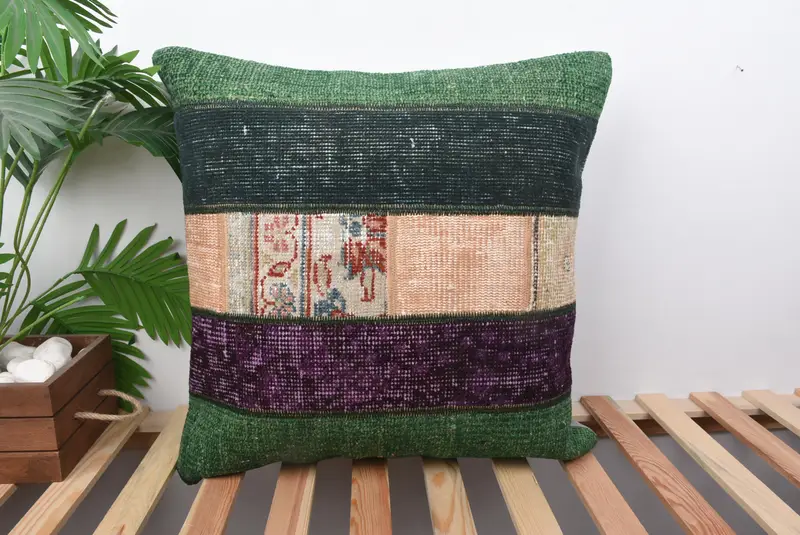 Almohada de lanzamiento de patchwork verde y naranja, cojín bordado vintage