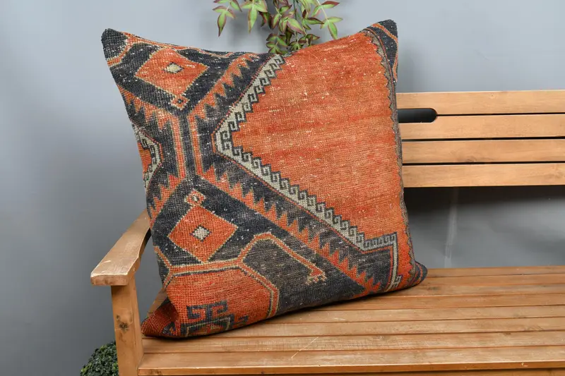Almohada de lanzamiento bordada del suroeste naranja, cojín de lino vintage 28x28
