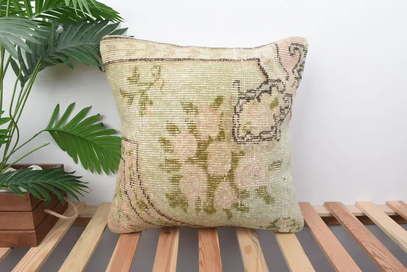 Almohada de tiro floral beige y verde hecha a mano, cojín de lino 18x18