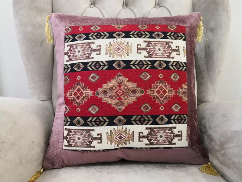 Almohada de tiro vintage bordada, almohada cuadrada geométrica roja y rosa