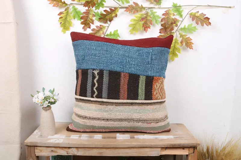 Almohada de tiro patchwork azul y beige, cojín bordado 22x22