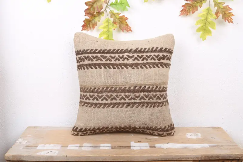 Almohada de tiro a rayas beige y marrón, almohada bordada vintage