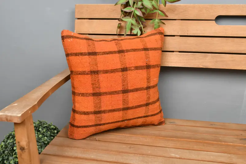 Almohada de tiro a rayas naranja y marrón, cojín bordado vintage