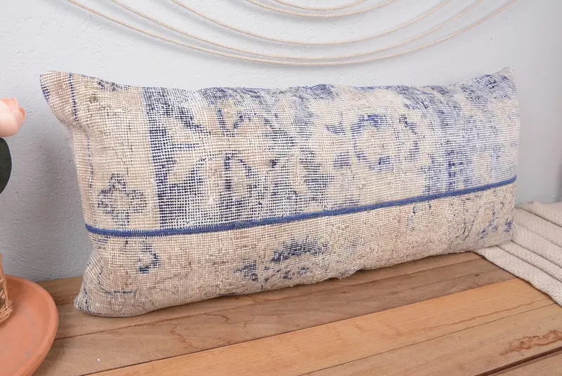 Almohada de lanzamiento de patchwork azul y beige bordada, almohada rectangular hecha a mano