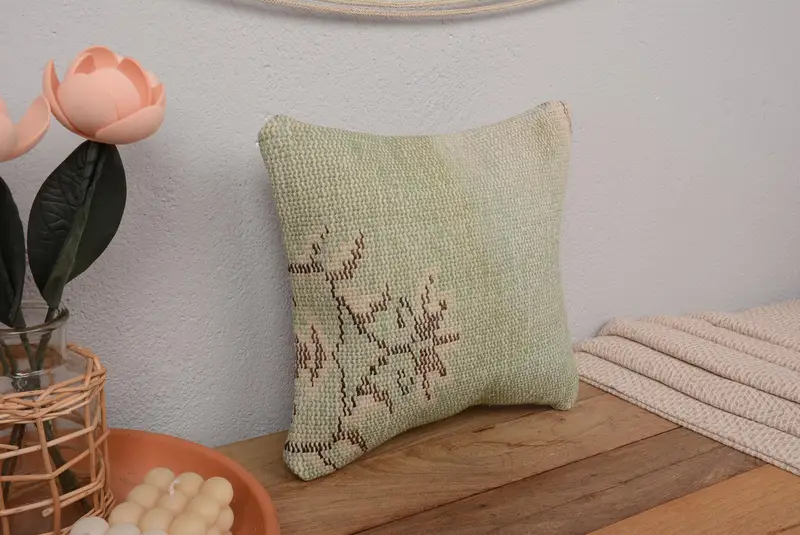 Almohada de tiro de lino verde hecha a mano, cojín vintage floral bordado