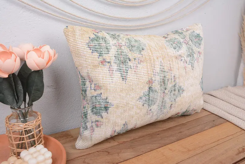 Almohada bordada floral beige y verde hecha a mano, almohada de lanzamiento rectangular versátil