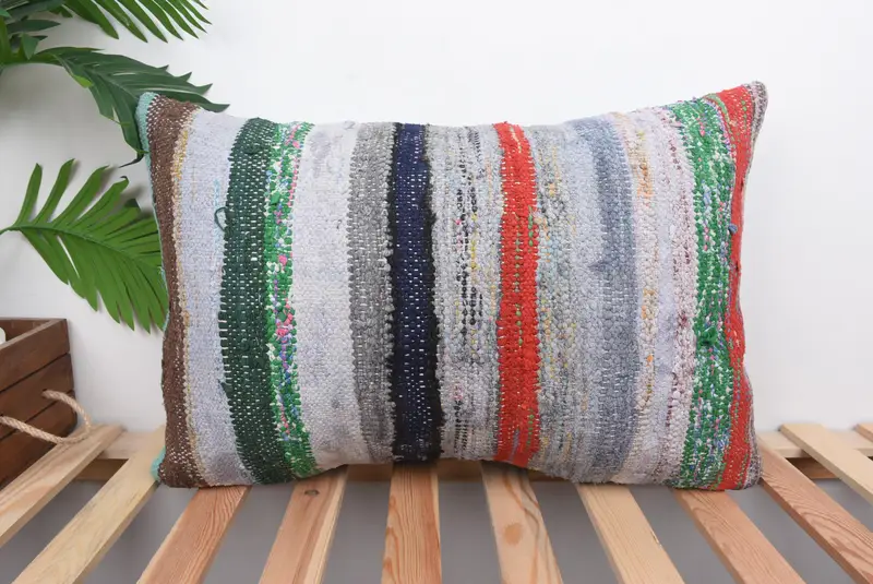 Almohada de tiro de rayas azules y rojas, cojín bordado hecho a mano