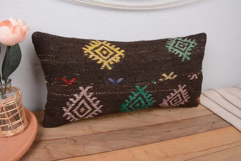 Almohada patchwork marrón y verde, almohada de tiro bordada 12x24