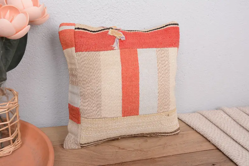 Almohada de tiro Kilim de patchwork beige y rojo, cojín vintage