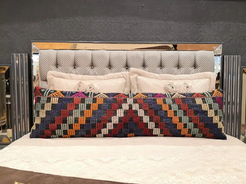 Almohada de lanzamiento de lana geométrica roja y bronce, almohada rectangular hecha a mano