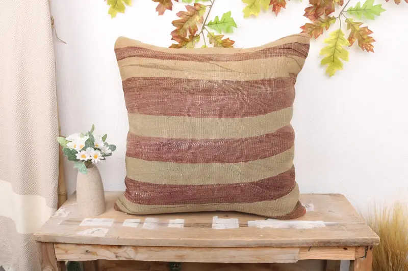 Almohada de tiro a rayas rojas y beige, cojín bordado hecho a mano