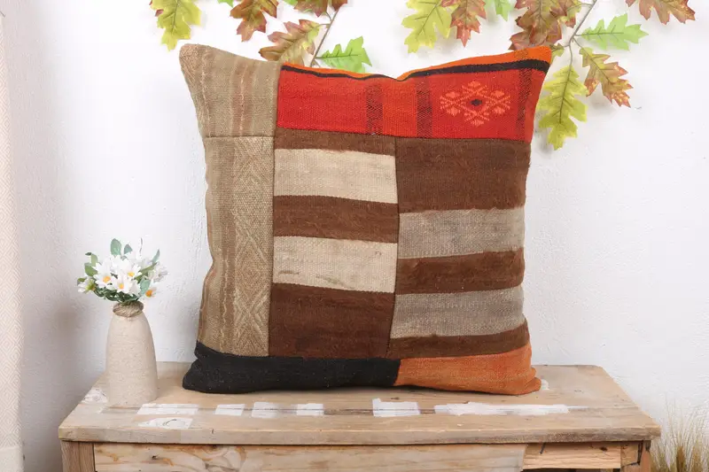 Almohada de tiro patchwork marrón y naranja, cojín bordado 22x22