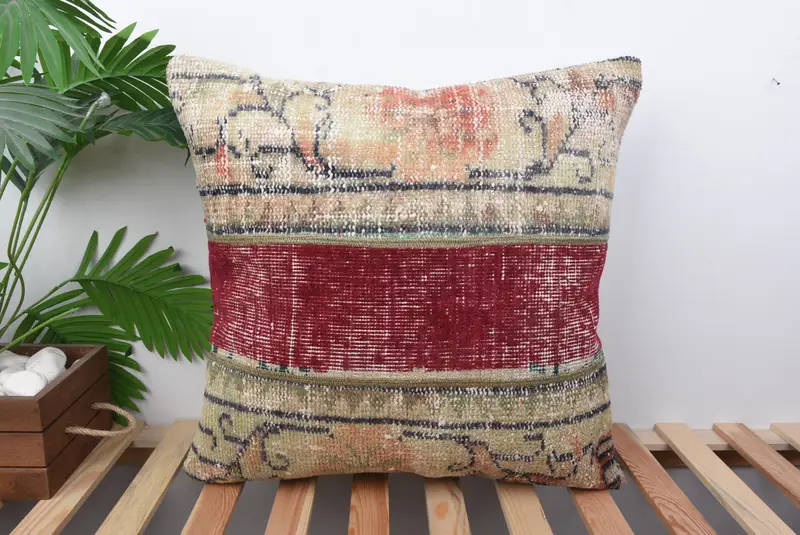 Almohada de tiro patchwork rojo y beige, almohada de lino bordada 22x22