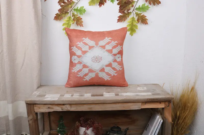 Almohada de tiro bordada naranja y blanca, almohada Chenille hecha a mano