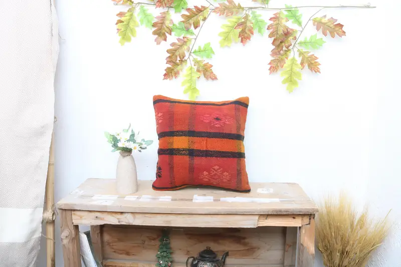 Almohada de tiro a rayas rojas y marrones, cojín bordado hecho a mano