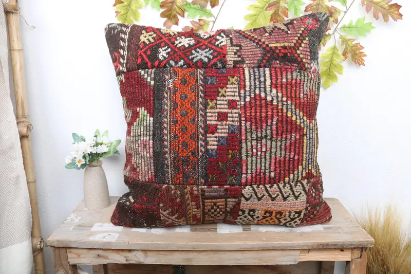 Almohada de lanzamiento de patchwork rojo y naranja, cojín bordado 24x24