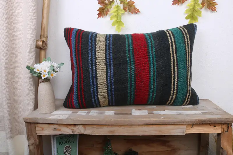 Almohada de tiro de rayas azules y rojas, cojín bordado hecho a mano