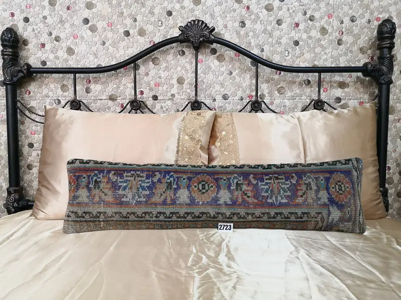 Almohada de lanzamiento de lana floral azul y naranja hecha a mano, almohada rectangular vintage
