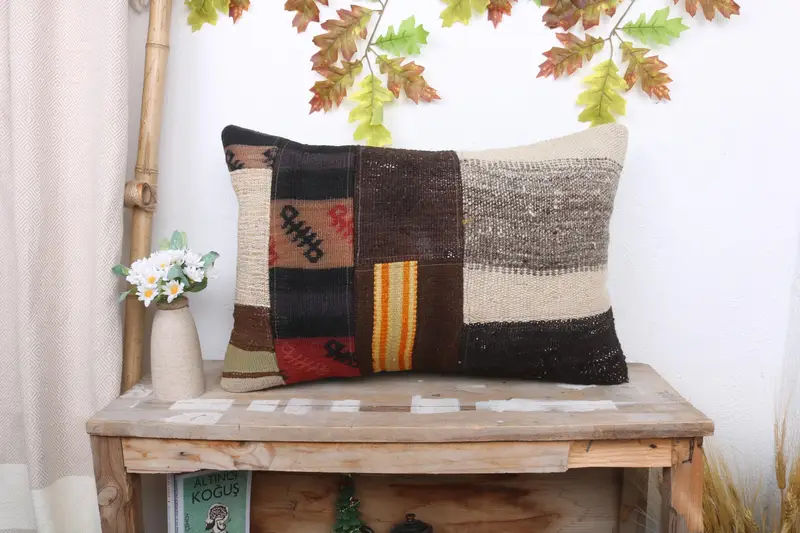 Almohada de tiro patchwork marrón y beige, cojín hecho a mano de 16x24