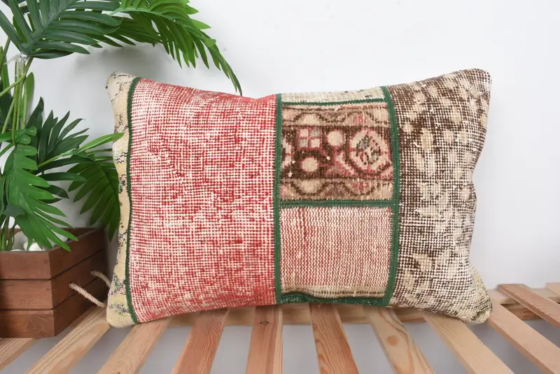 Almohada de lanzamiento de patchwork rojo y marrón, cojín de lino hecho a mano de 16x24