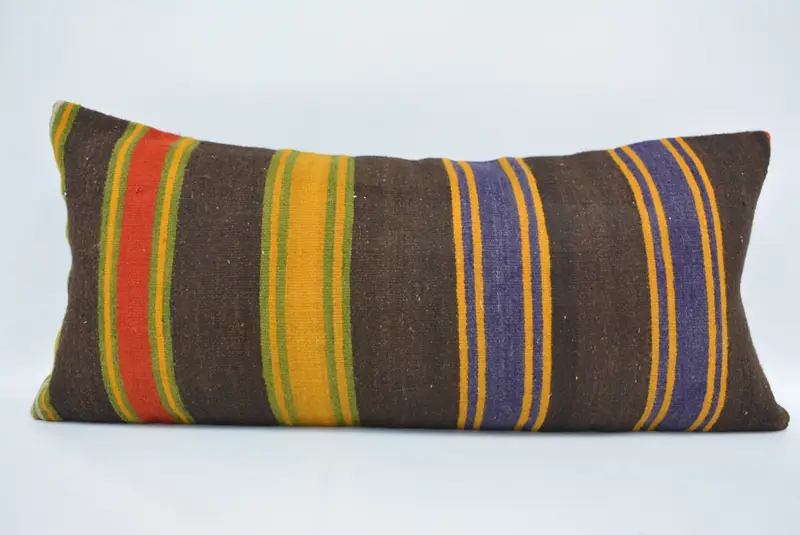 Almohada de tiro a rayas hecha a mano, cojín marrón y morado de 16x36