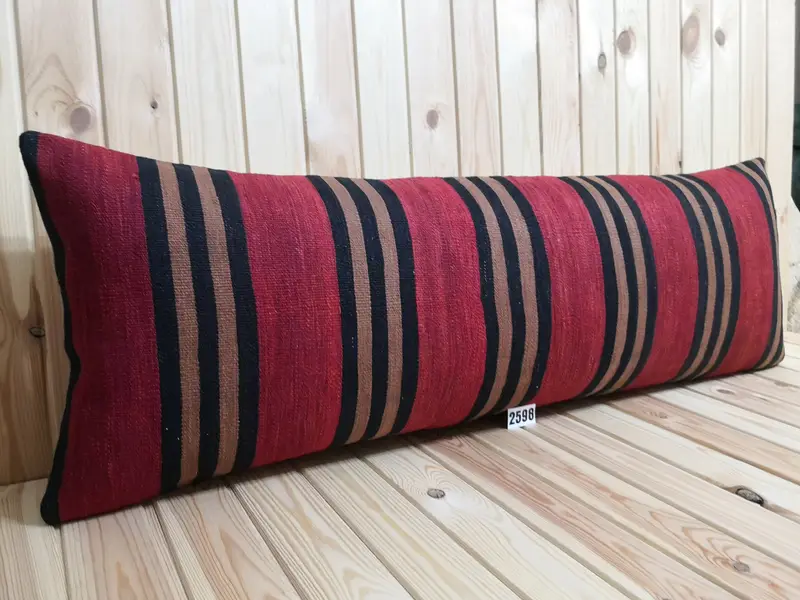 Almohada de tiro de lana a rayas rojas y negras hecha a mano, rectángulo de 16x48 pulgadas