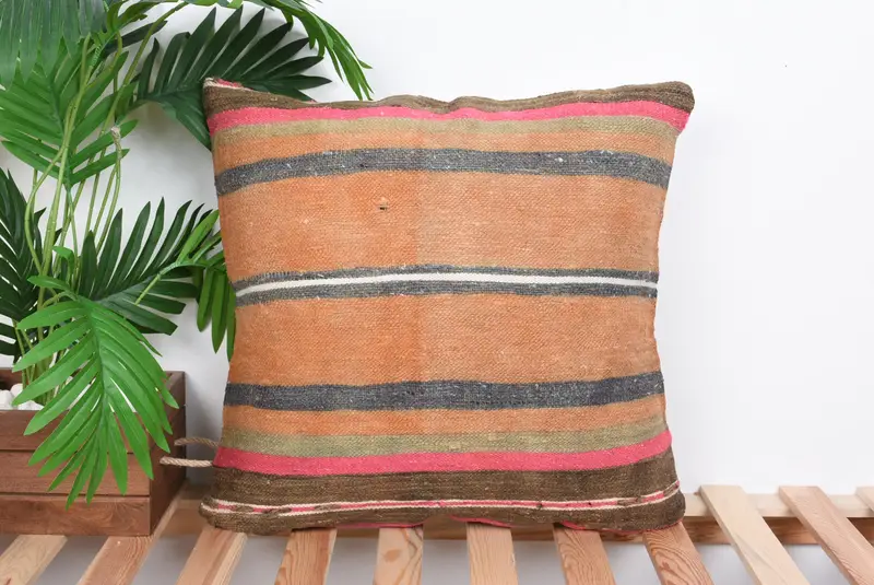 Almohada de tiro a rayas naranja y marrón, cojín bordado hecho a mano