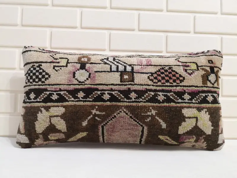 Almohada de lanzamiento de lana hecha a mano, cojín vintage geométrico marrón y gris