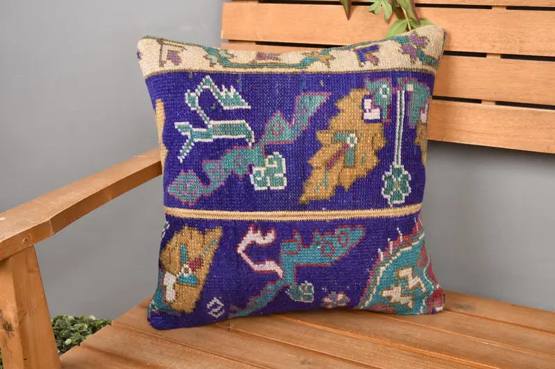 Almohada de lanzamiento Kilim de patchwork azul y naranja, cojín vintage bordado