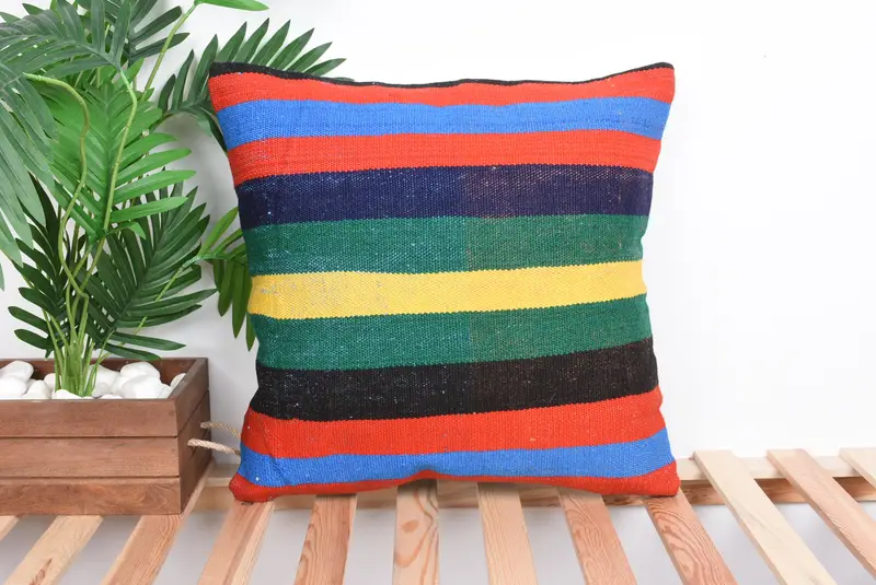 Almohada de tiro de rayas azules y verdes, cojín vintage bordado