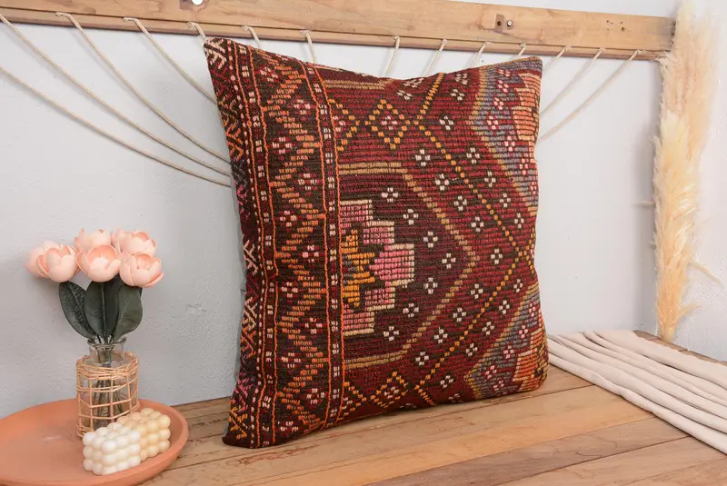 Almohada de tiro bordada roja y rosa, cojín geométrico hecho a mano