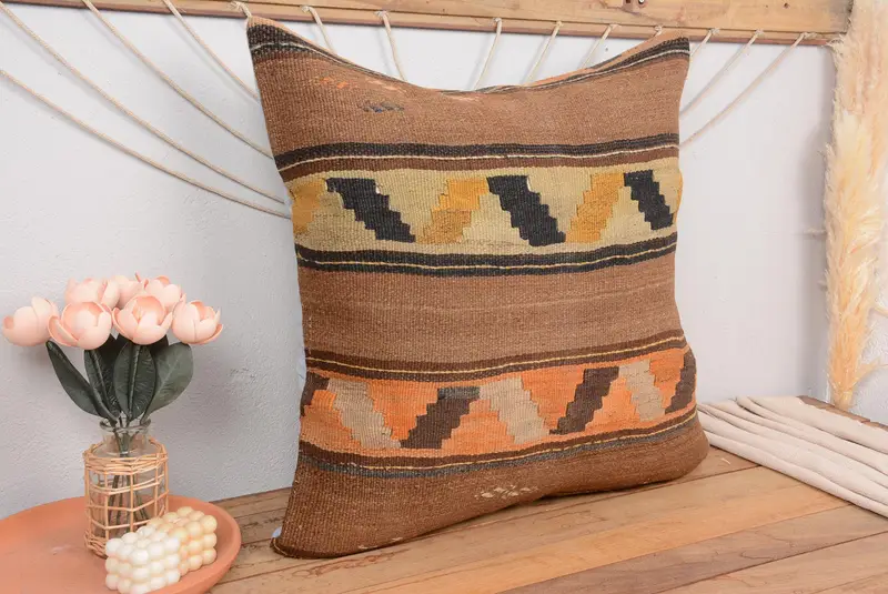 Almohada de lanzamiento geométrico marrón y naranja, cojín bordado vintage