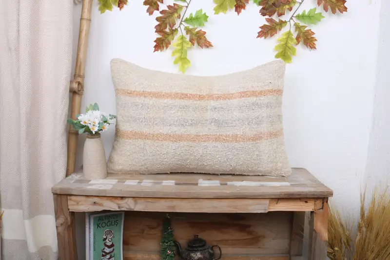Almohada de tiro de lino a rayas hecha a mano, cojín bordado vintage
