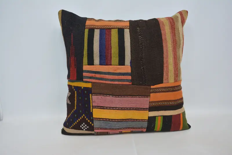 Almohada de tiro a rayas marrón y naranja, cojín de cáñamo y lana hecho a mano