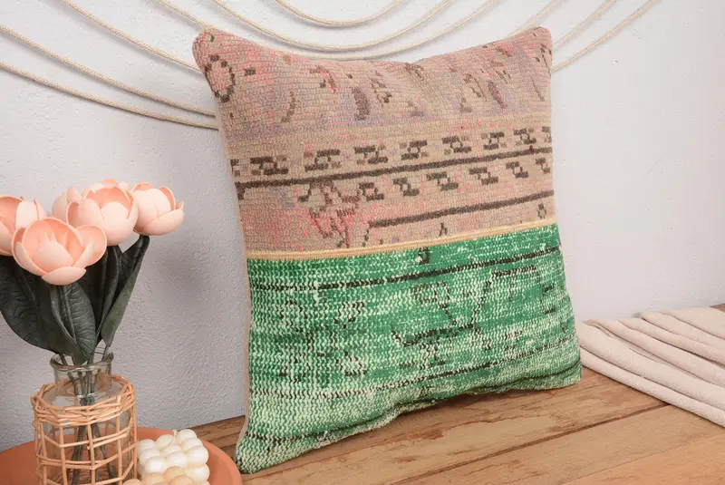 Almohada de tiro de patchwork verde y marrón hecha a mano, cojín bordado vintage