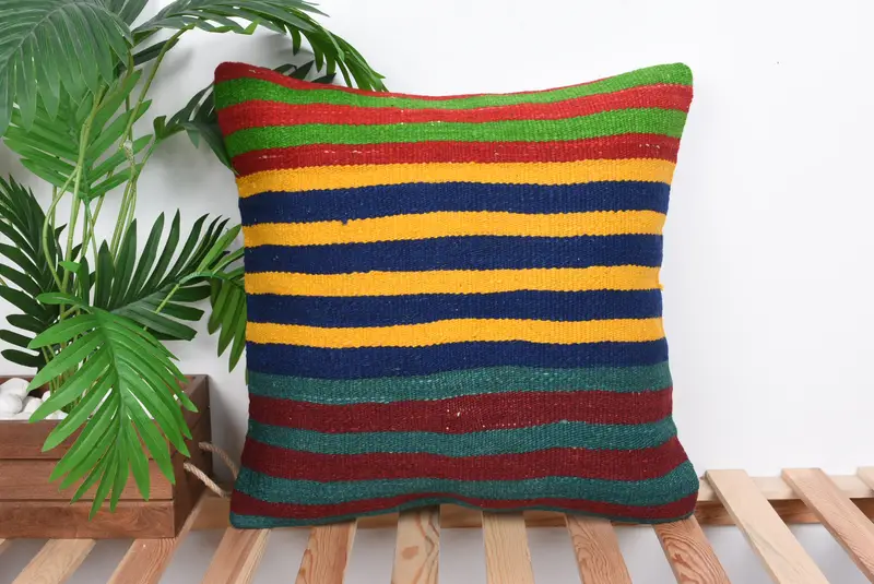Almohada de tiro de rayas azules y amarillas, cojín bordado vintage