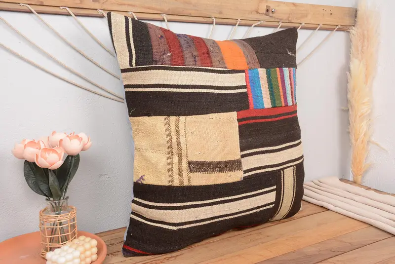 Almohada bordada de patchwork beige y marrón, decoración vintage hecha a mano