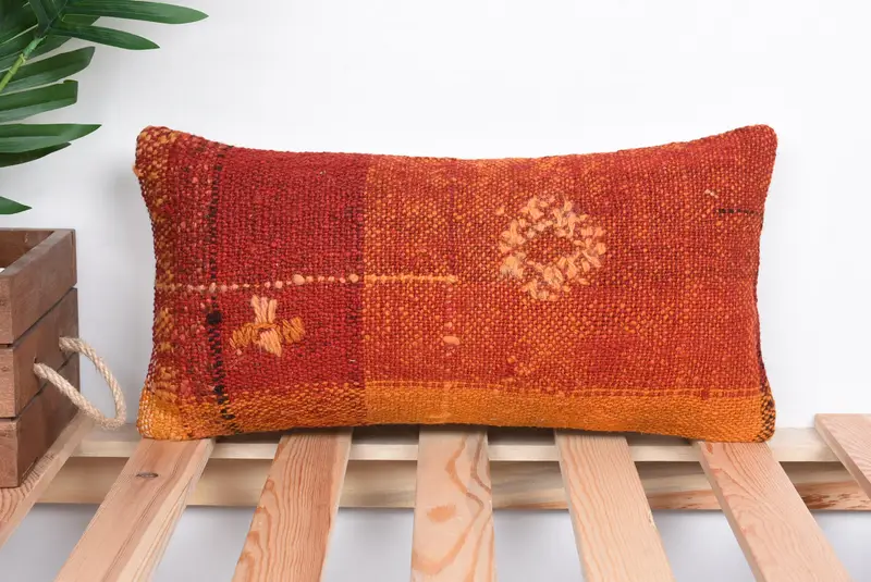 Almohada de tiro bordada roja y naranja, almohada de lino vintage 8x16