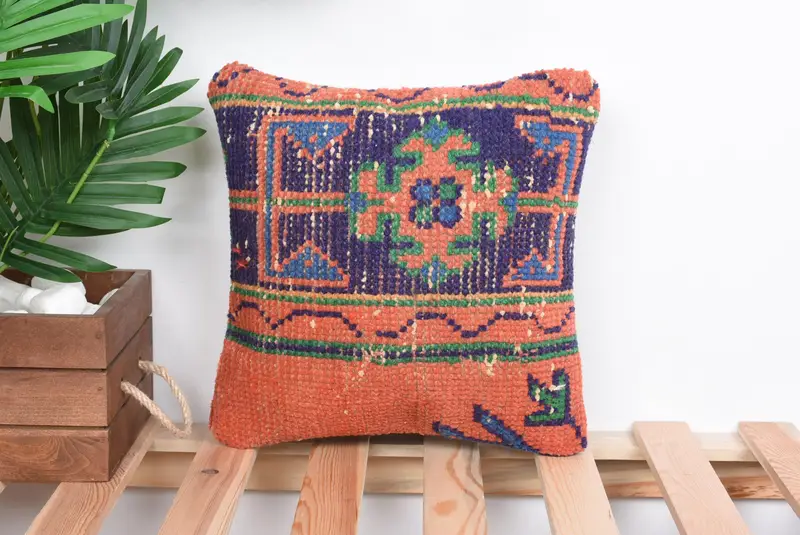 Almohada de tiro floral azul y naranja hecha a mano, cojín bordado 12x12