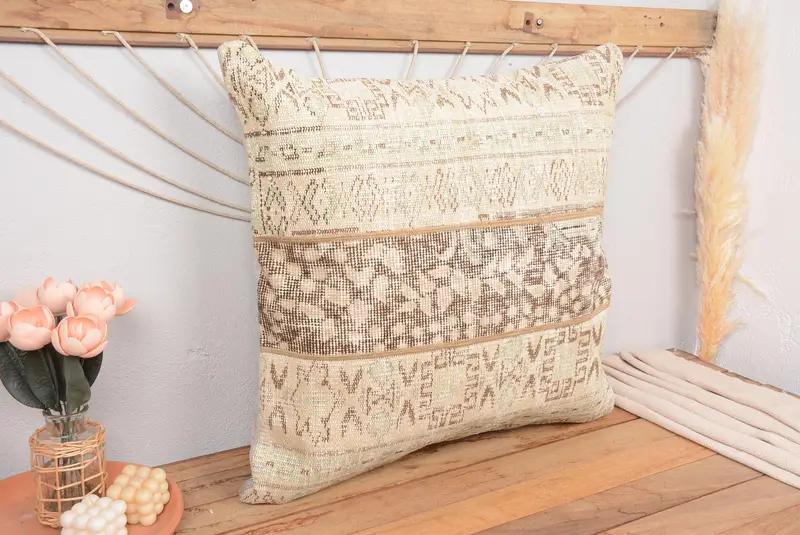 Almohada de lanzamiento bordada beige y marrón, almohada de lanzamiento de patchwork vintage