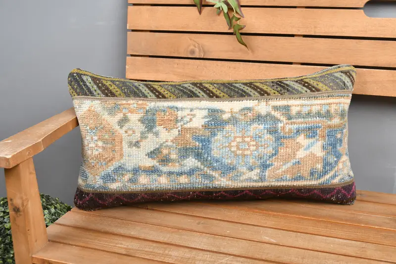 Almohada de lanzamiento de patchwork azul y marrón, cojín bordado hecho a mano