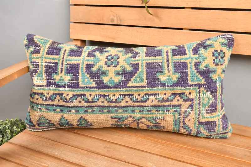 Almohada de tiro bordada floral azul y roja, cojín vintage hecho a mano