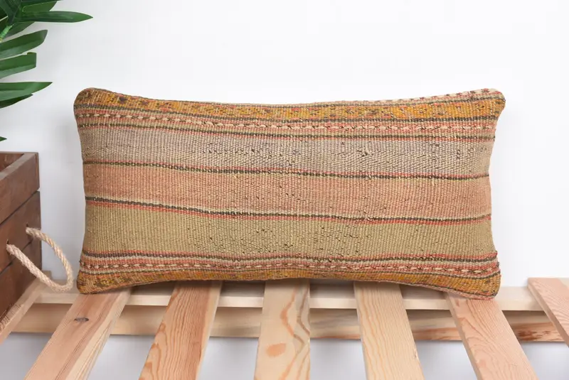 Almohada de tiro de rayas marrones y verdes, almohada rectangular vintage bordada